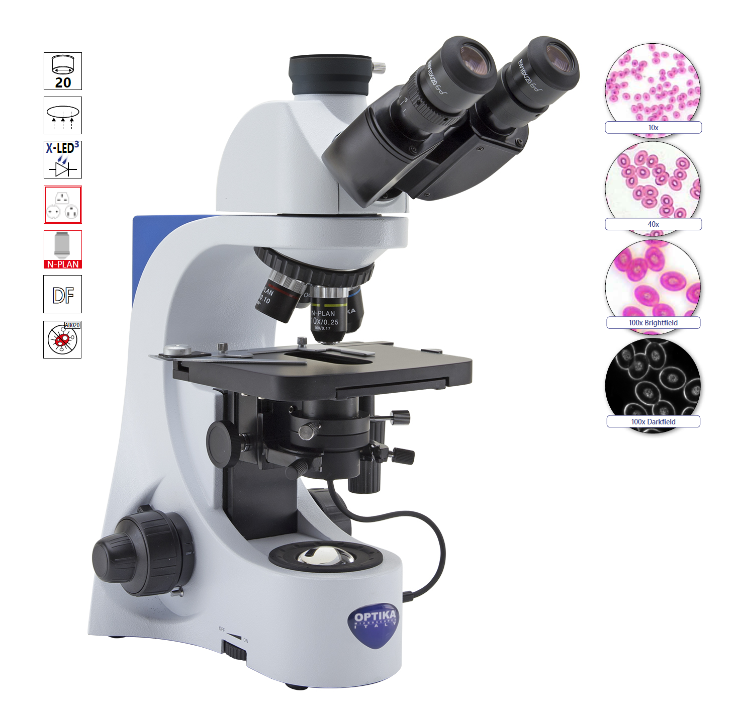 Trinocular microscope for high-performance oil immersion darkfield (live blood analysis) and brightfield, with X-LED³ illumination. |