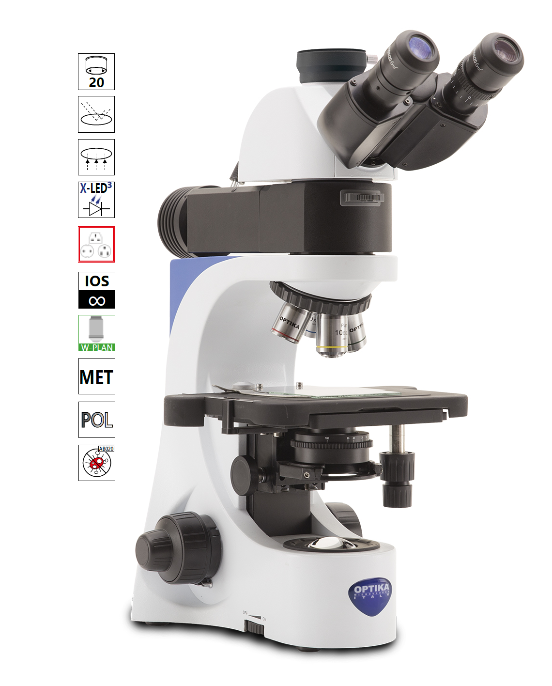 Part of the advanced B-380 series, the OPTIKA B-383MET is a versatile metallurgical microscope designed for both transmitted and incident light applications. It is ideal for brightfield and incident polarized light observation of opaque specimens. It features a trinocular head for digital documentation and a powerful dual illumination system, combining a transmitted X-LED³ with an incident X-LED³ epi-illuminator with its own polarizer and analyzer.