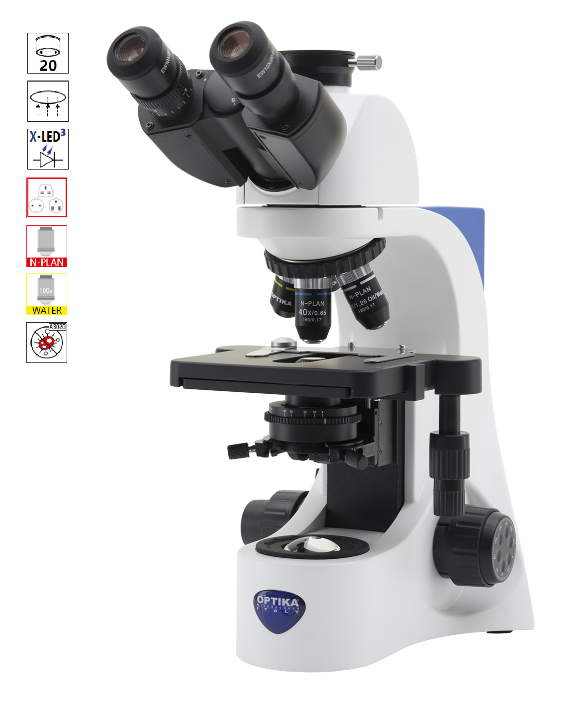 Illumination (Fixed Koehler type): X-LED³ with white 3.6 W LED (6,300K) with brightness control. Multi-plug 100-240Vac/6Vdc external power supply. |