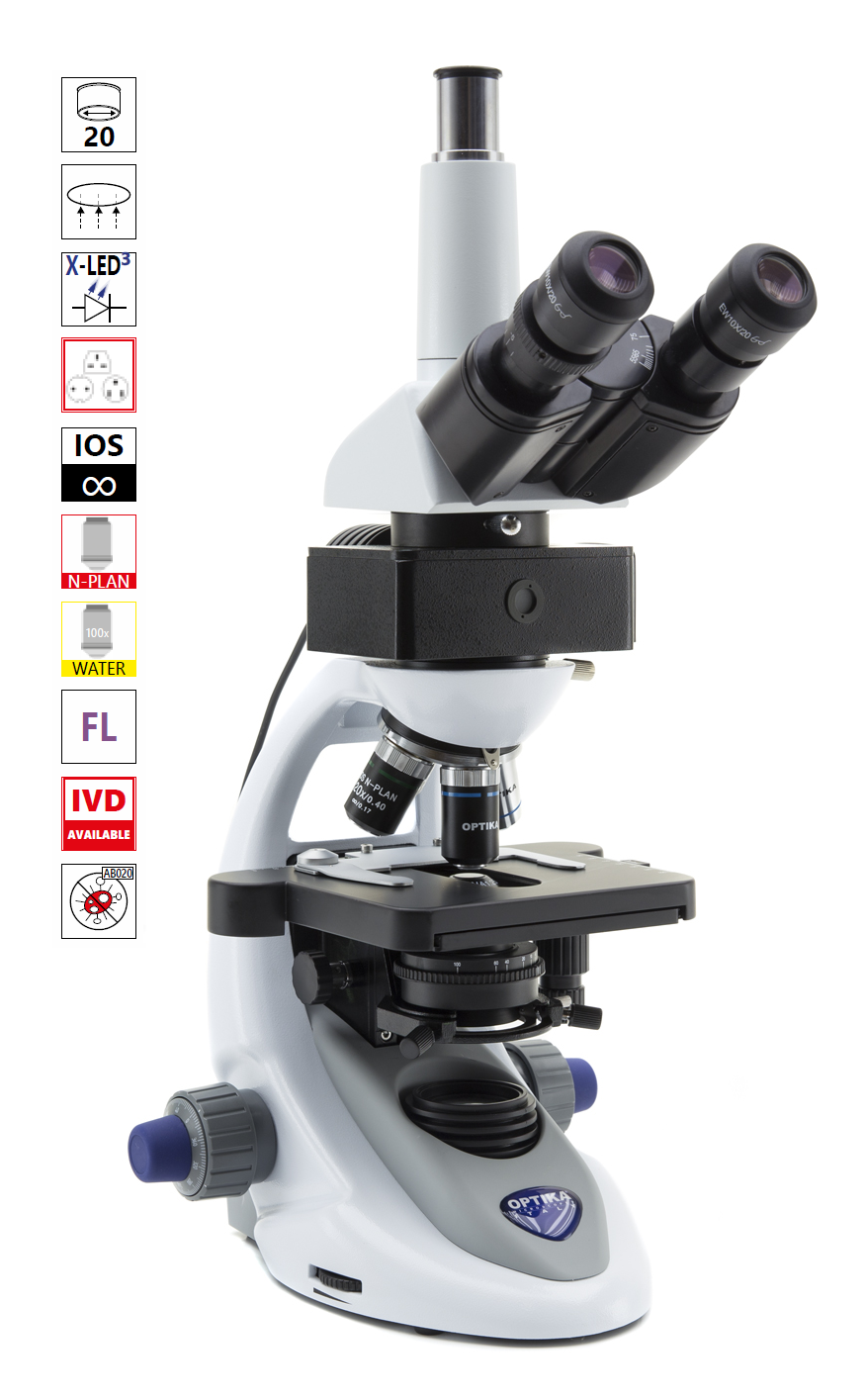 Trinocular microscope for LED fluorescence and brightfield, with IOS objectives, rackless stage, and dual X-LED³ / LED illumination system. |